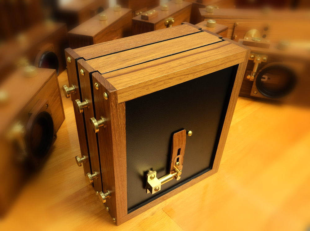 The wooden parts (fashioned from quality Thai teak wood) are first kiln dried and then machine milled into correct size. Matte black paint is applied to the interior of the camera to prevent internal reflections. All inner edges of the camera are covered with a black velvet lining which helps to prevent light leaks even in bright sunlight.